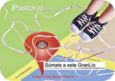 En este cartel del Lema Pastoral 2013-2014 del Colegio Santa María la Blanca hemos querido plasmar y compartir lo que esperaba el Papa Francisco de la JMJ en Brasil: “¡Espero Lío, un Gran Lío!”. Éste lío es sinónimo de Evangelización. Una evangelización de y en la calle, no recluidos en nuestro escondite particular lleno de comodidades, sino en cualquier parte del mapa terrestre, allí dónde lo necesiten o nuestros terminales móviles nos lleven.